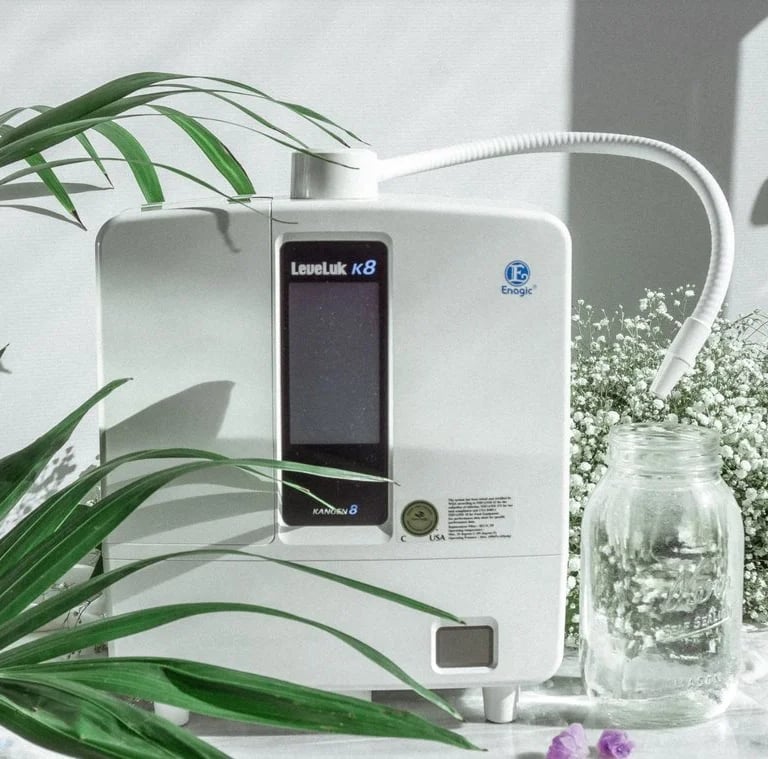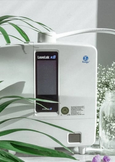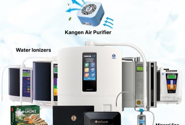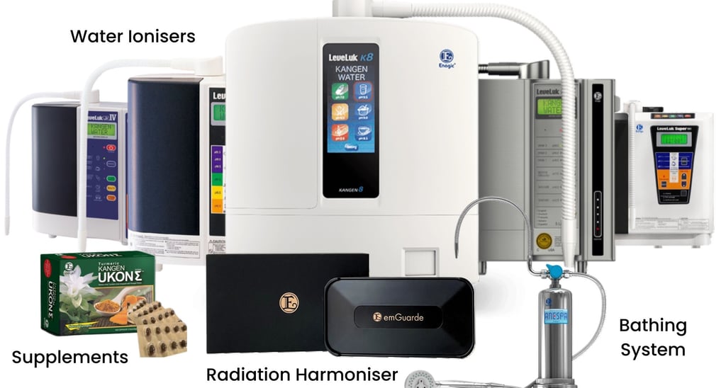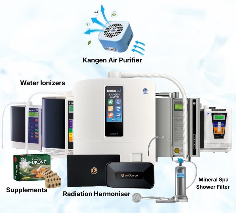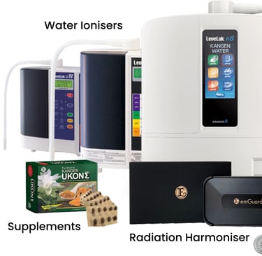 Medical-grade ionizers delivering molecular hydrogen therapy daily. Whole house EMF blocker (EmGuarde). Japanese-inspired shower filter; stimulating a natural hot springs. Kangen Air Purifier. Kangen Ukon healthy antioxidant Tumeric supplements and tea from Okinawa.